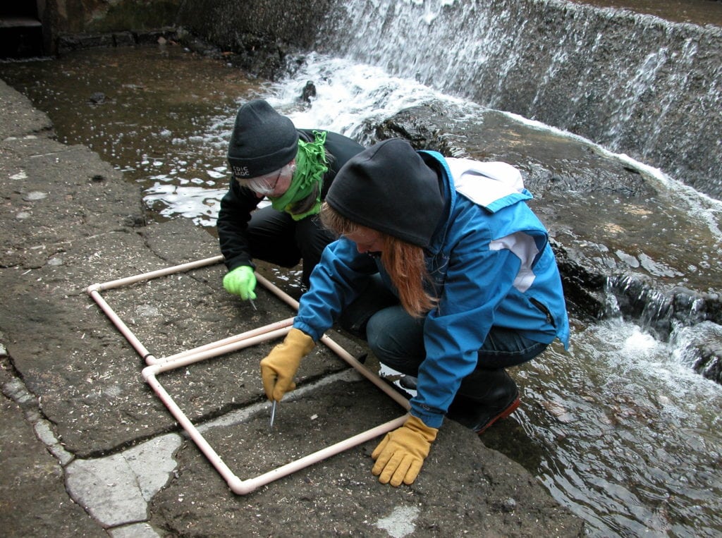 - Jacqueline Madill scraping zebra mussels from a 5 cm by 5 cm quadrat into a small ziplock back at Hog’s Back Falls in Ottawa. (Photo | Museum of Nature)